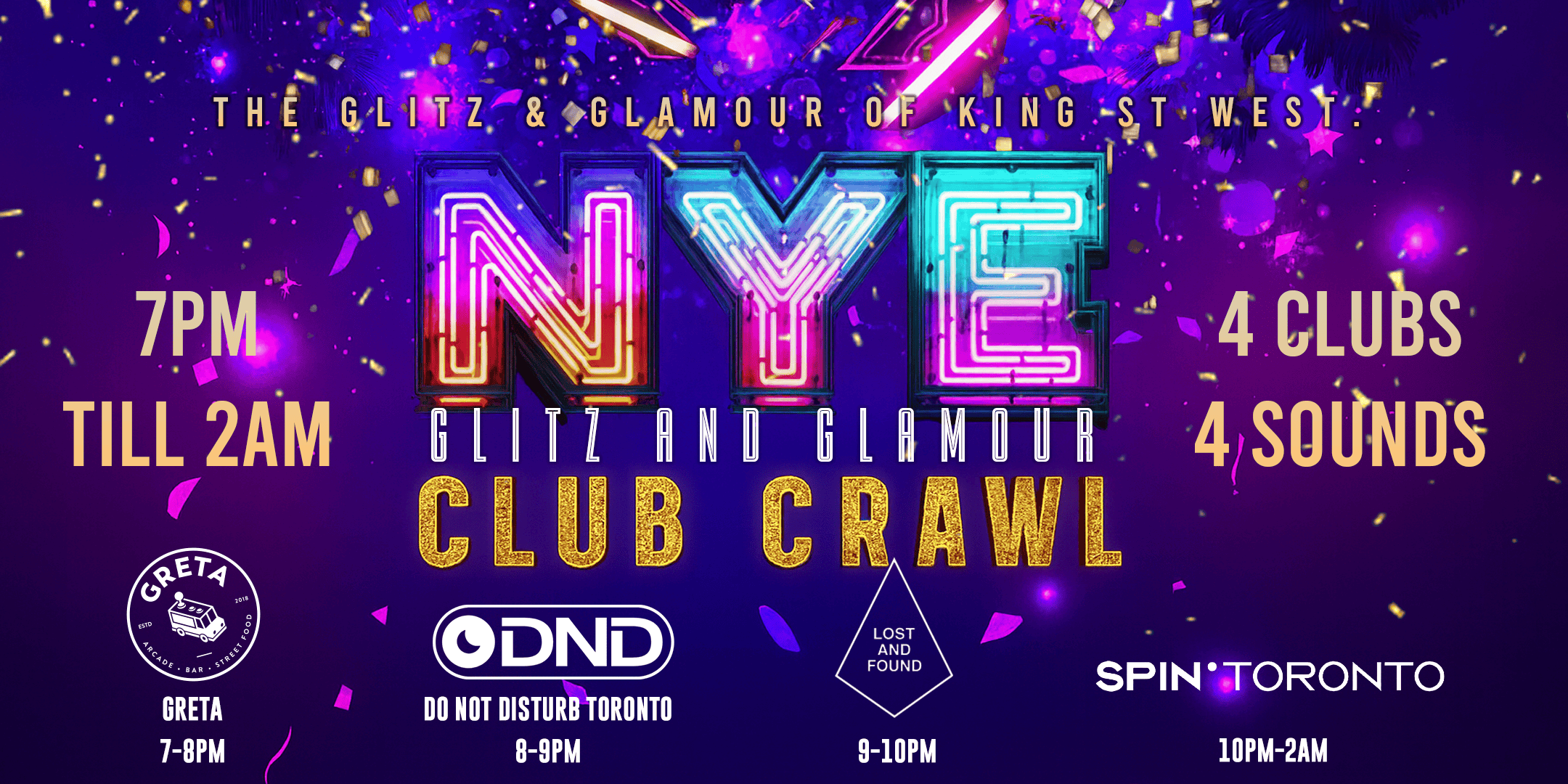 Nightlife Toronto. A colorful advertisement showcasing four clubs with various DJ schedules and event details in Toronto.