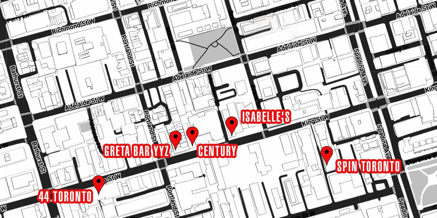 Clubs in Toronto nightlife venues. Map of Toronto nightlife with key club locations including 44 Toronto, GRETA BAR YYZ, CENTURY, ISABELE’S, and Spin Toronto.